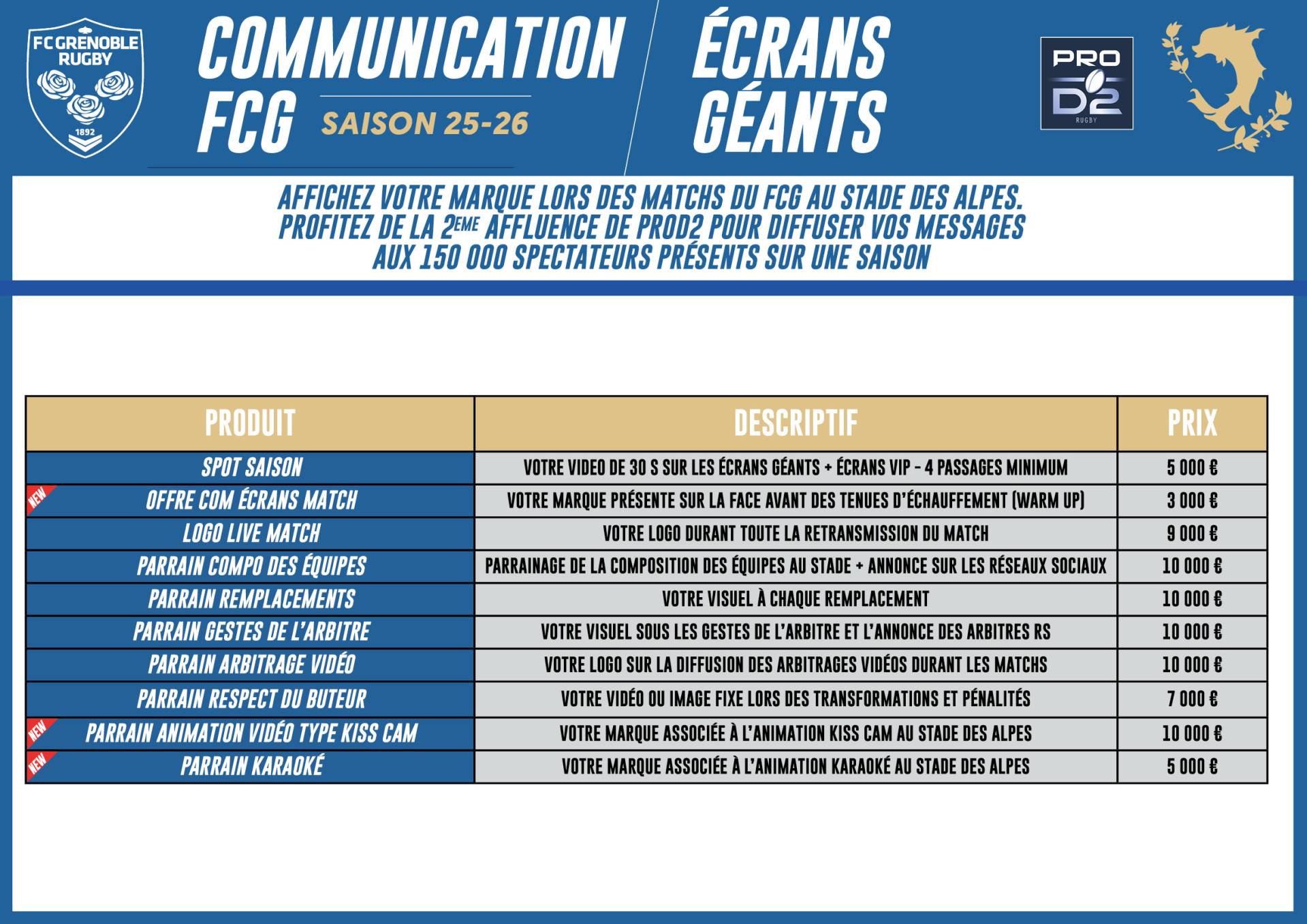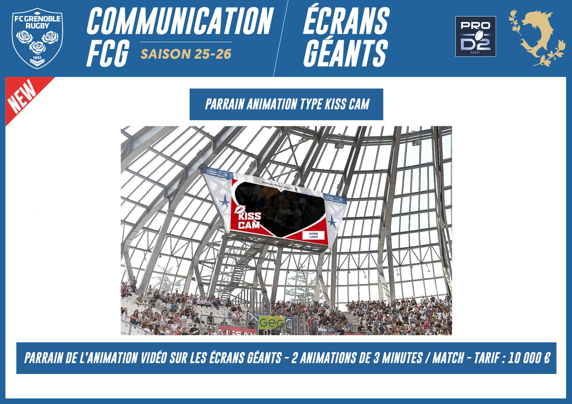 Affichez votre marque sur les écrans géants du stade et les TV des espaces réceptifs partenaires lors des matchs du FCG au Stade des Alpes lors des 15 rencontres de ProD2 à domicile. Profitez de la 2e affluence de ProD2 pour diffuser vos messages au plus de 183 000 spectateurs présents sur une saison.